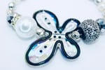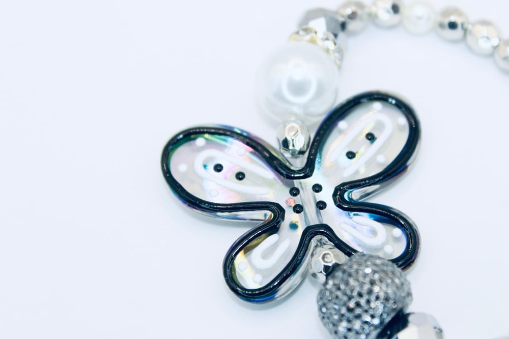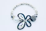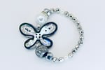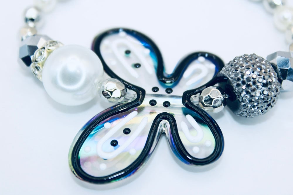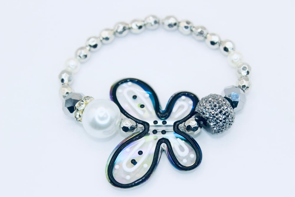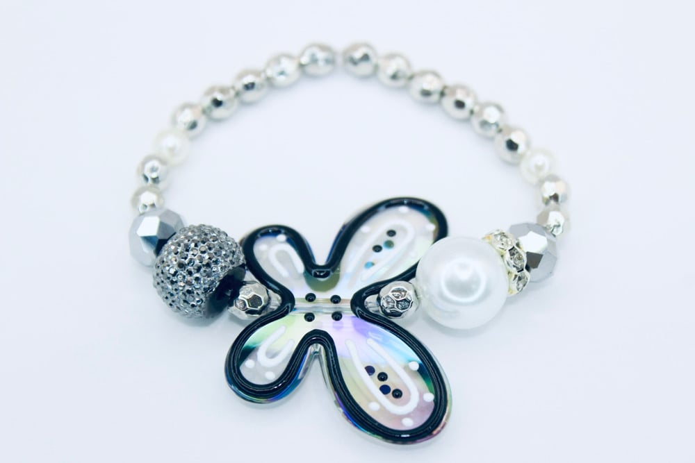 Beautiful Acrylic Iridescent Black Butterfly with metallic beads & black gem-cut beads. Wear this stretch bracelet to complement any outfit!