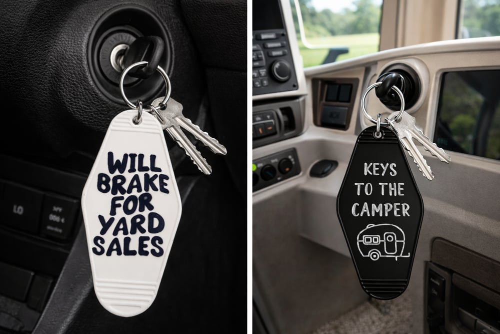Fun Motel Keychains for bargain hunters or an open road junkie ready for Adventure! Made of plastic. Keys not included.