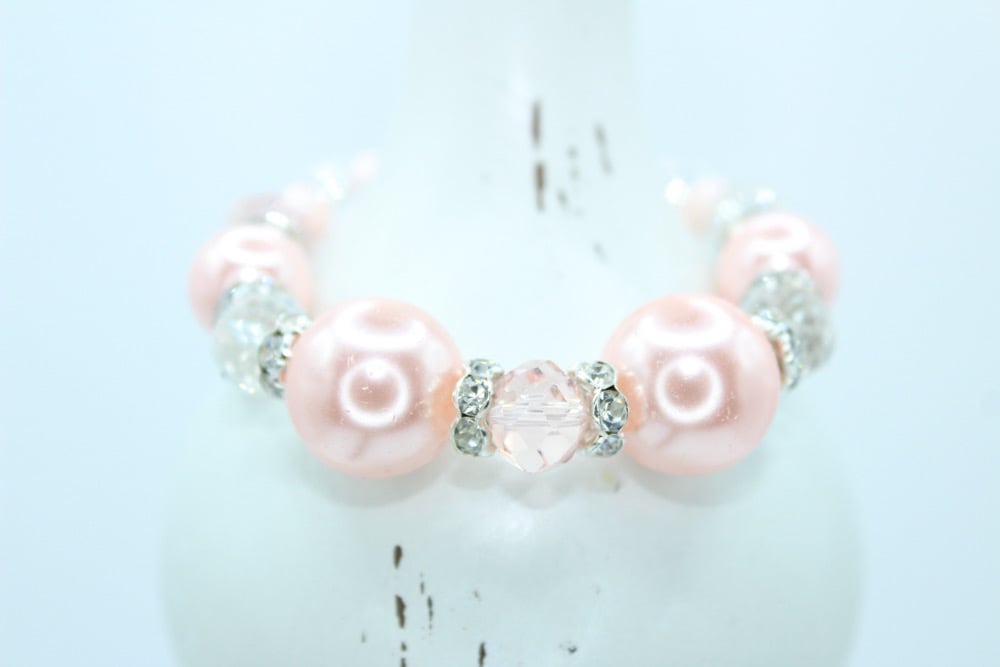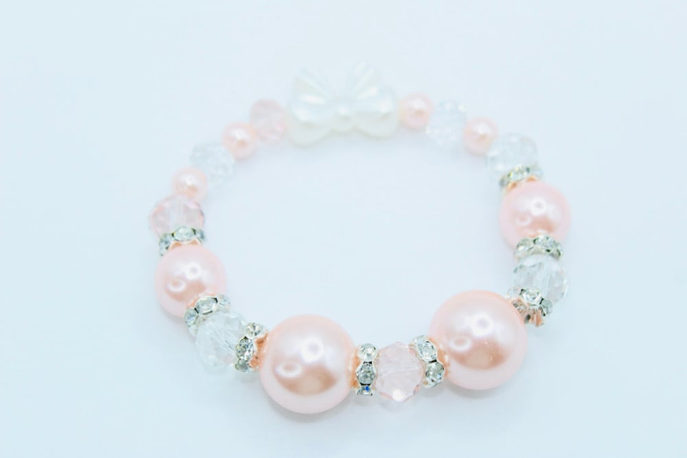 Gorgeous Stretch Bracelet made with Pink Glass, Pearls, Crystals & Rhinestones. The back of the bracelet (under the wrist) has a white bow to make your Jewelry stand out with an Elegant Touch!